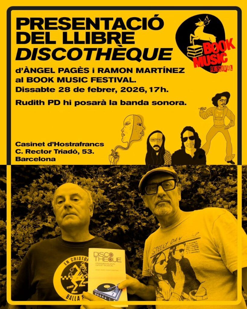 ‘Discothèque’ és una obra amb textos i imatges a cavall de la divulgació i la crònica vivencial consagrada a la música i a la passió dels seus autors per la música. La presentació al Book Music Festival és fa com dèiem dissabte a les cinc de la tarda al Casinet d’Hostafrancs i un cop més hi posarà la banda sonora la punxadiscos Rudith PD.