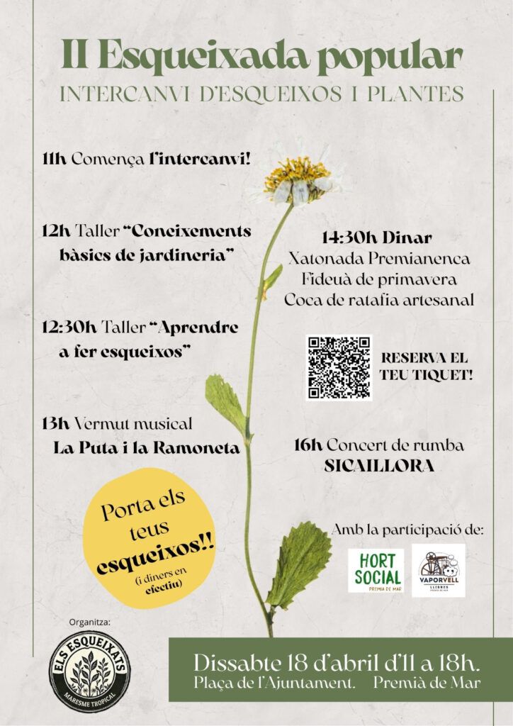 El programa s’enceta a les 11 del matí amb l’espai d’intercanvi, on participen a més dels veïns diversos cultius i hivernacles de la zona i també l’Hort Social de Premià de Mar. Després, a partir de les dotze, es faran tres tallers: dos sobre l’obtenció i la cura d’esqueixos i un altre de recuperació d’orquídies (qui hi participi se’n podrà endur una). A la una tenim vermut musical amb La Puta i La Ramoneta i tot seguit dinar popular (on hi haurà, naturalment, esqueixada), un dinar on ahir ja s’hi havien apuntat més de 70 persones. La jornada es tancarà amb una actuació del grup de rumba premianenc Sicaillora. També tindrem durant tot el dia a la plaça una parada de llibres de plantes de la llibreria Vapor Vell.