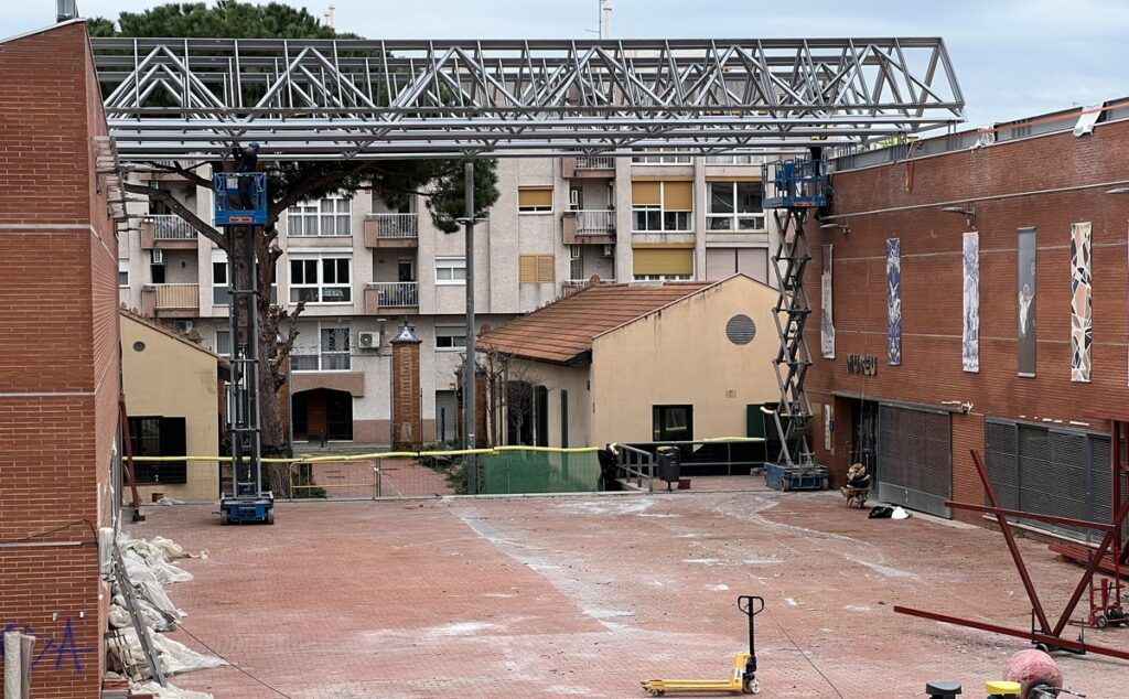 Ja s’han col·locat sobre la plaça Salvador Moragas tres de les nou encavallades que aguantaran la pèrgola fotovoltaica