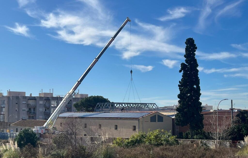 La pluja ha obligat a variar el calendari que s’havia fixat inicialment però finalment ahir dimarts es van poder elevar i col·locar dues encavallades més entre les naus del Museu de l’Estampació, que sumades a la que ja es va instal·lar el dia 26 de gener conformen el primer paquet de tres encavallades que sostindran la futura pèrgola fotovoltaica, i que en seran nou en total. Des d’abans de Nadal l’empresa adjudicatària de les obres ha estat muntant les encavallades primer a fàbrica i després a la mateix plaça, i com diem des de la setmana passada una grua de grans dimensions les ha estat elevant i muntant sobre les bigues que s’havien col·locat prèviament al capdamunt de les naus.
