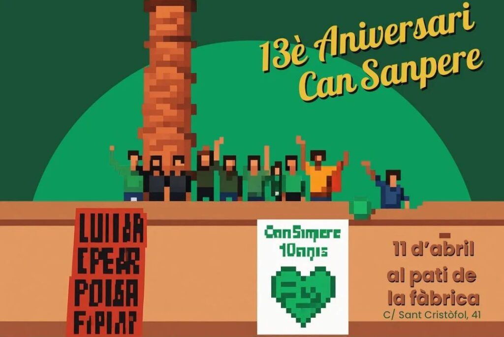 L’Associació Can Sanpere anuncia aquests dies l’acte de celebració del 13è aniversari de l’ocupació de la fàbrica, una celebració que podrà tornar al recinte fabril després que sigui de titularitat municipal i després que la zona de l’entrada i el pati ja tinguin un accés segur. La festa es farà dissabte vinent 11 d’abril justament en aquest pati central i començarà a dos quarts de dotze del migdia. A aquella hora la companyia Carpe Diem oferirà l’espectacle ‘El Maestro’. A dos quarts d’una es farà una presentació per explicar com evoluciona el procés d’enderroc i de definició d’usos futurs de l’espai, presentació que es farà bo i fent un vermut, i tot seguit podrem prendre part d’una xerrada sobre la situació a Palestina de part del col·lectiu Premià amb Palestina. Així arribarem al dinar, que serà una paella i per la qual cal reservar tiquet. Després, a quarts de quatre, en Godai Garcia farà un monòleg (amb taquilla inversa) i la jornada es tancarà a les quatre de la tarda amb un concert de Salamandra Duo (també amb taquilla inversa).